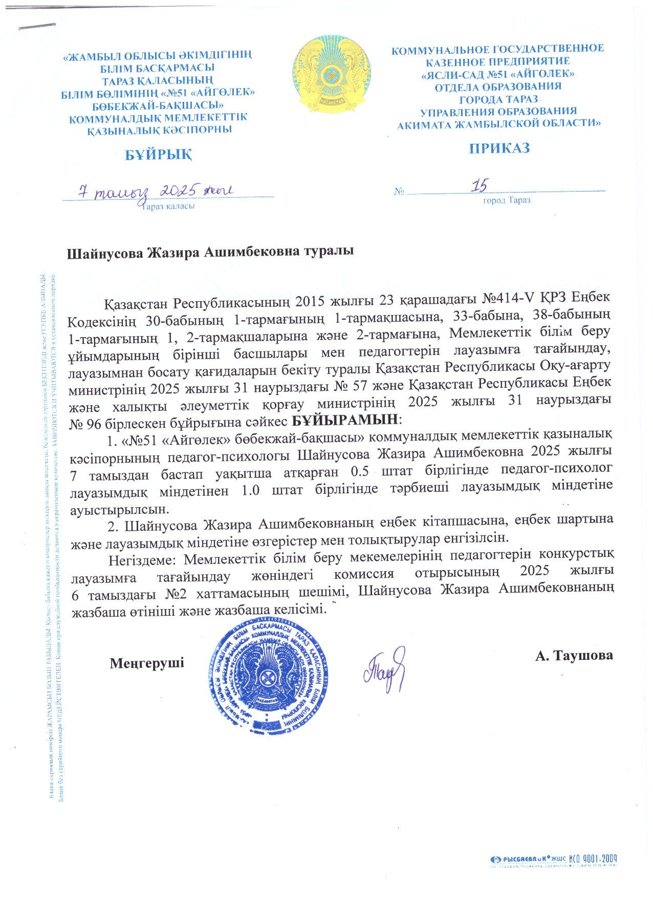 Алғыс хат. Шайнусова Жазира Ашимбековна. 2025ж