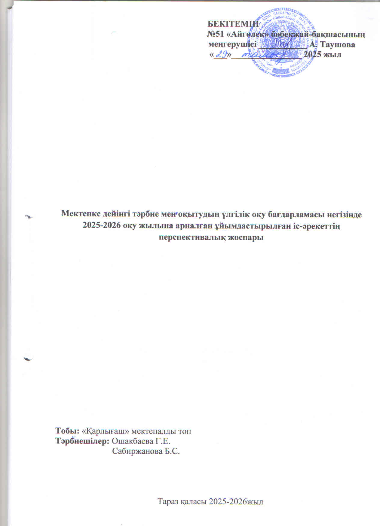 Мектепке дейінгі тәрбие мен оқытудың үлгілік оқу жоспары және мектепке дейінгі тәрбие мен оқытудың оқу бағдарламасы негізінде 2025-2026 оқу жылына арналған ұйымдастырылған іс-әрекетінің перспективалық жоспары мектепалды "Қарлығаш" топ
