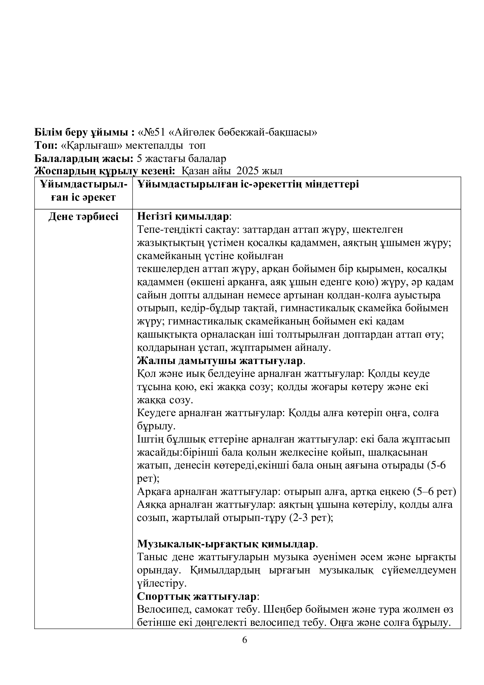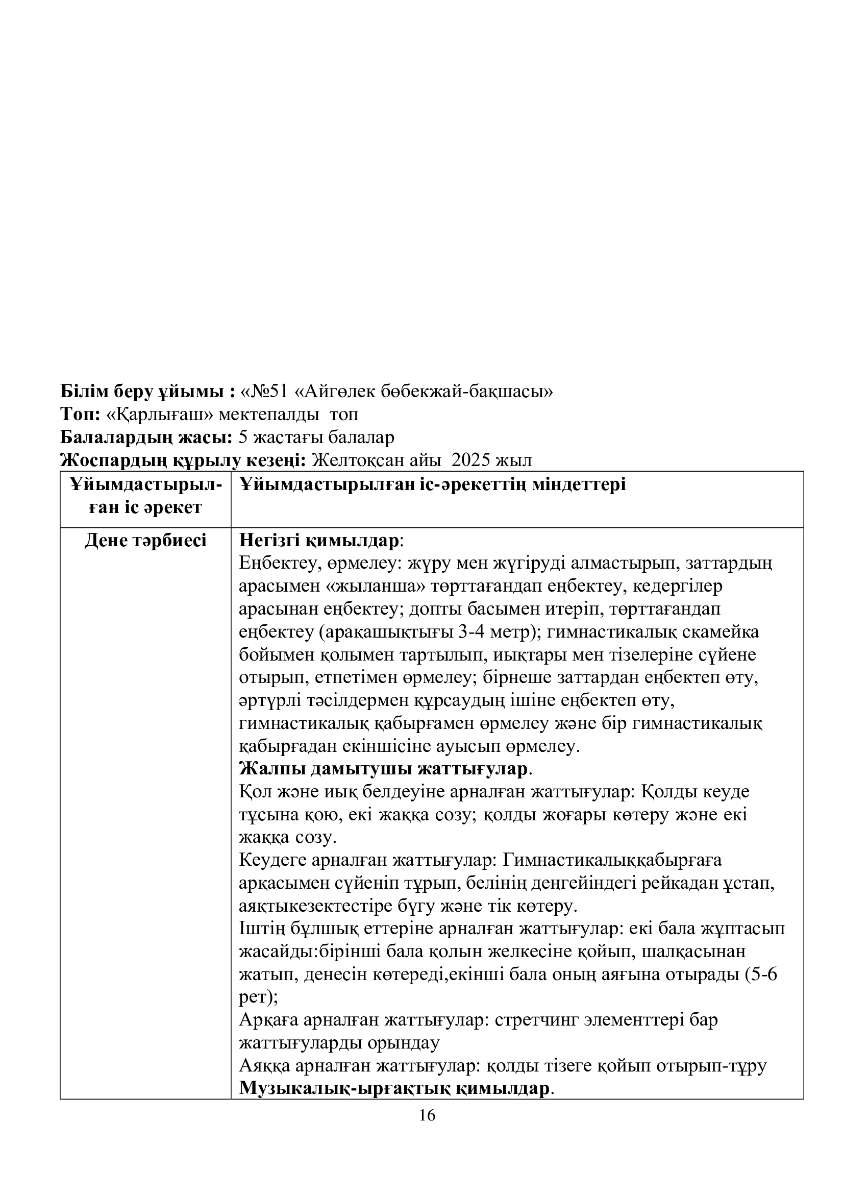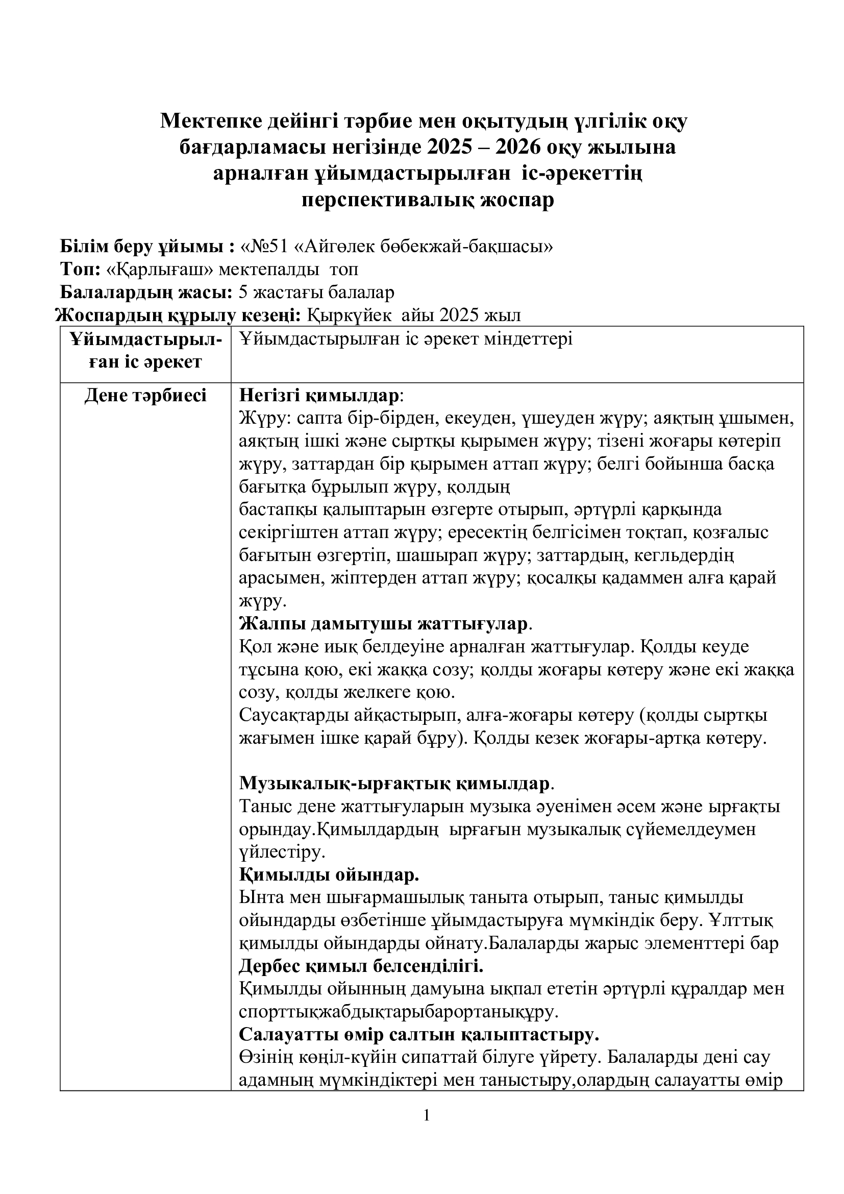 «№51 «Айгөлек» бөбекжай-бақшасы» » Тәрбиелеу-білім беру процесі » ПЕРСПЕКТИВАЛЫҚ ЖОСПАР » Мектепке дейінгі тәрбие мен оқытудың үлгілік оқу жоспары және мектепке дейінгі тәрбие мен оқытудың оқу бағдарламасы негізінде 2025-2026 оқу жылына арналған ұйымдастырылған іс-әрекетінің перспективалық жоспары мектепалды "Қарлығаш" топ